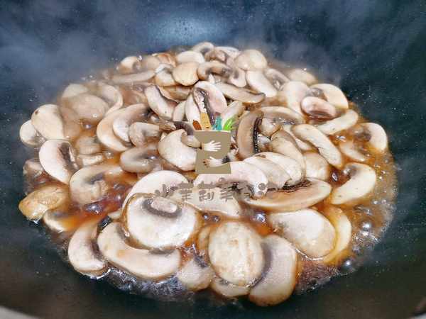 3、炒口蘑一定不能少放蒜,我家炒的时候一般会分两次放,起锅烧油,放入一半,炒香时把口蘑放进去,快速煸炒均匀后,调入一点生抽,口蘑是比较吃油的,这个时候往往锅内很干,这时候我们可以调入一点热水或高汤,然后快速炒匀,把口蘑焖三分钟,使其彻底成熟。