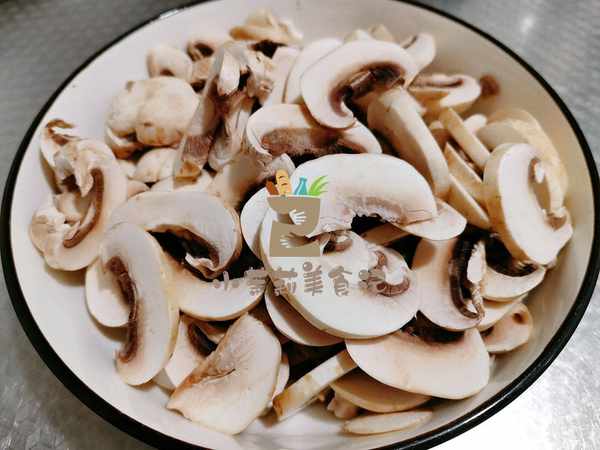 1、将口蘑搓洗干净,两面都要搓洗,接着切成略厚一些的片,装进盘中。