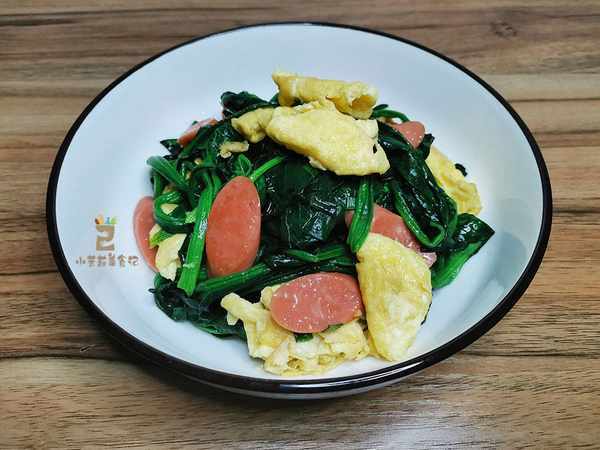4、底油中放葱末蒜末炒一炒,放入火腿肠先快炒十几秒,倒入菠菜炒匀,最后把鸡蛋再次倒进去,调入一馁馁食盐,炒入味,即可出锅上桌。