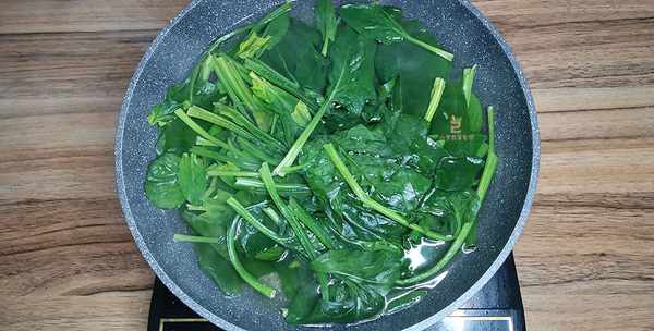 1、一把菠菜摘掉破损的叶子,鲜嫩完整的部分洗净沥干,丢进开水里烫半分钟,捞出来备用。