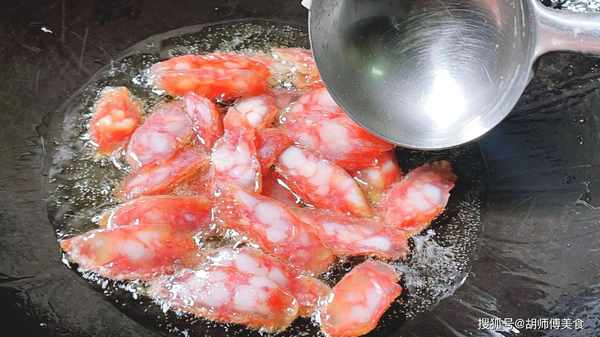 第四步:将锅烧热后,放少许油到锅中,然后把甜肠放入到锅中,用中火炒30秒左右,直到将将甜肠炒熟即可起锅。