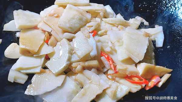 第五步:将小米椒、蒜末放入到锅中爆香,然后再把春笋放入到锅中,爆炒半分钟后,接着将生抽、食盐、鸡精、生抽全部放入到锅中炒匀。如果您喜欢吃特别烂的春笋,大家可以放半碗水,将春笋焖煮3分钟。