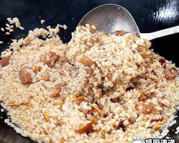 麻油炒香饭加肉、调味料,取出肉蒸30分。