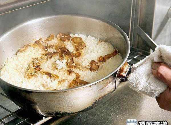 蒸好的饭加肉、酒、水煮至汤汁微收干。