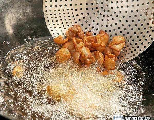 肉切块加酒、太白粉拌匀腌15分,过油至表皮金黄捞起。