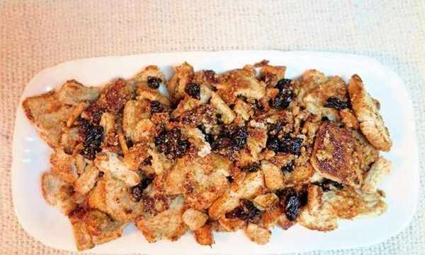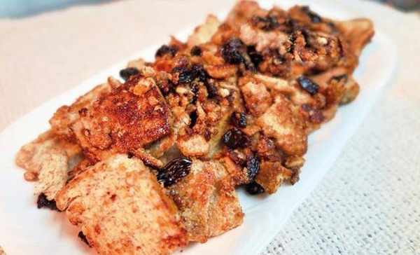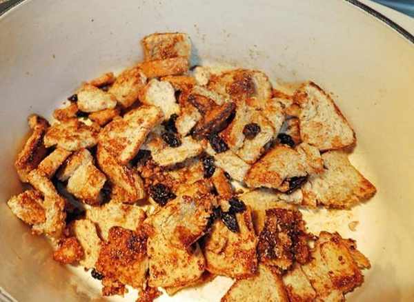 经过翻炒均匀沾上琥珀色焦糖的吐司再加入葡萄干就可以熄火了(果干和坚果都适合放进来)。