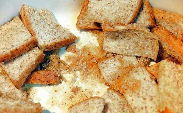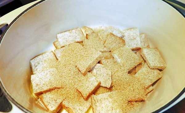 首先奶油先入锅用小火融化(全程都是小火),接着放入吐司和糖翻炒(糖要分次加)。