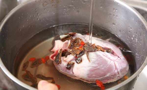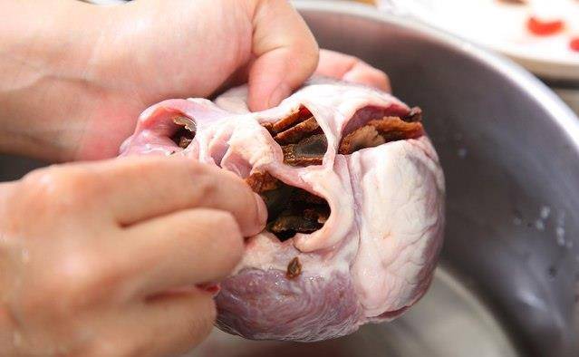 先制作猪心参汤。猪心彻底洗净,血管中的血块要彻底清出。