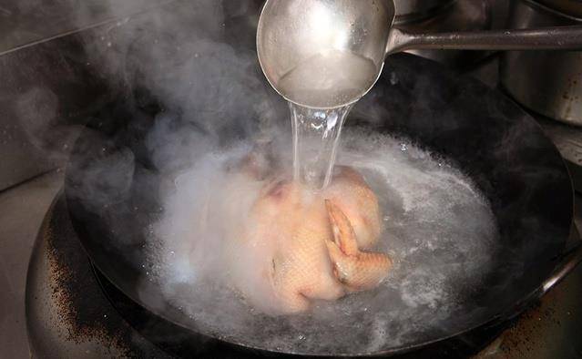 起锅开大火,倒入盖过鸡的水量,将鸡倒入加以汆烫,5分钟后捞起。