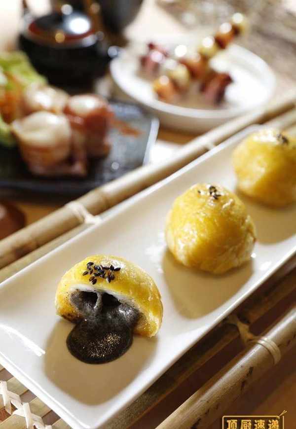 芝麻汤圆10颗、蛋黄1颗、酥皮5片、黑白芝麻少许