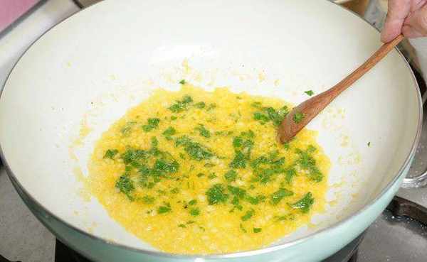 蒜泥加无盐奶油炒香,加人巴西里、盐、糖拌匀成蒜香酱备用。