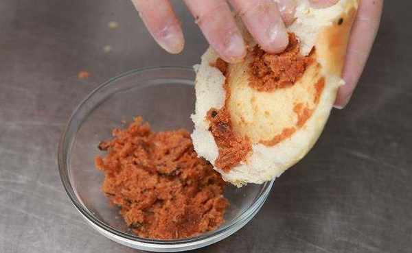 肉松起酥面包由底部取出下层面包体,接着挖出肉松,再将挖肉松时剥离的面包碎块平压回面包底层,形成咸派底座。