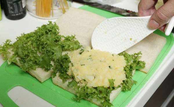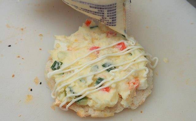 取步骤1的咸派底座,先铺上起司片,再铺满步骤2的马铃薯沙拉、挤上美乃滋。