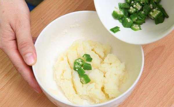 将秋葵碎加入马铃薯泥中,再倒入鲜奶搅拌均匀。