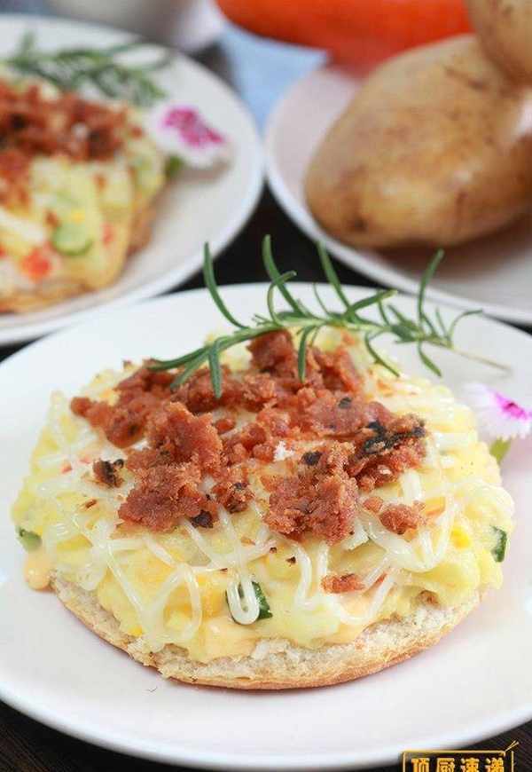肉松起酥面包1个、熟马铃薯1颗、小黄瓜丁半条量、玉米粒2大匙、红萝卜丁1/3条量、白煮蛋1颗、起司片1片、美乃滋适量