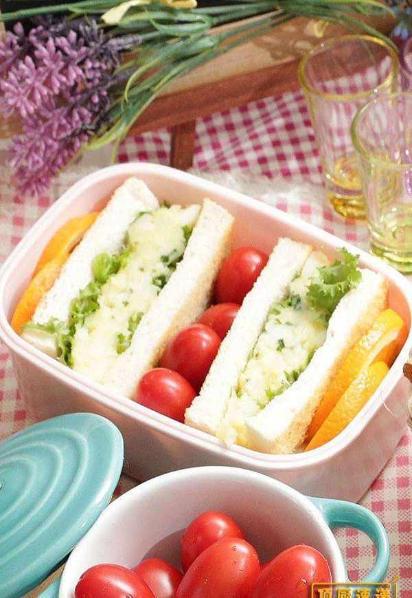 马铃薯2颗、吐司6片、生菜适量、香橙片适量、小番茄适量、蒜泥2大匙、无盐奶油2大匙、巴西里1大匙