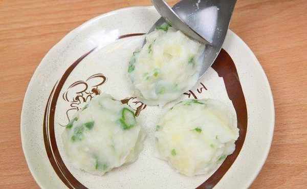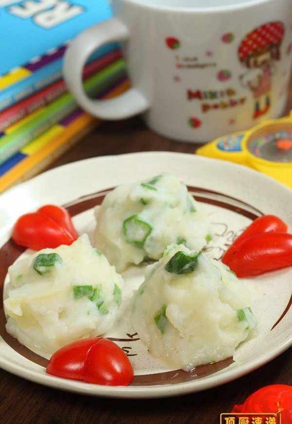 将马铃薯洗净、去皮后,接着入锅蒸约15分钟至熟透,接着取出放入碗中,用汤匙压成泥状。