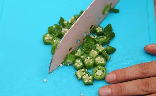 小番茄洗净、对切。秋葵洗净后放入滚水中汆烫约30秒捞起,旋即放入冰水中冰镇。接着将秋葵切碎。