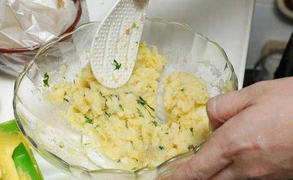 将蒸熟后的马铃薯捣成泥状,并加入蒜香奶油拌匀。