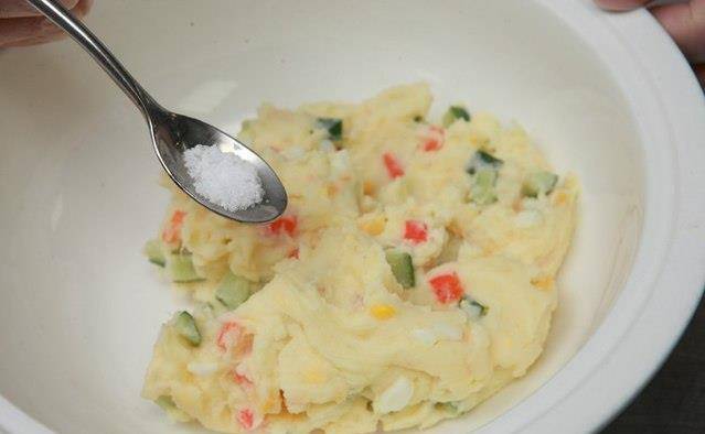 熟马铃薯压成泥状,拌入小黄瓜丁、玉米粒、红萝卜丁和白煮蛋,再以盐、糖和胡椒粉调味,即成马铃薯沙拉,备用。