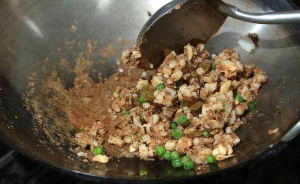 热锅,加1大匙油,先加入胡荽子、少许盐爆香,再加老姜碎、碎腰果、青辣椒、青豆、葡萄干与马铃薯泥拌炒至金黄,加内馅调味料炒匀备用。