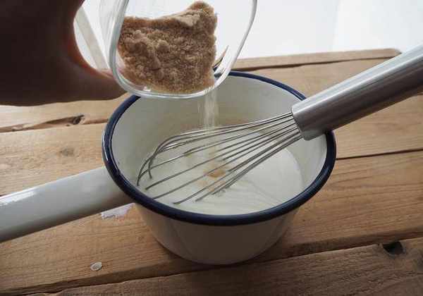 2.在小锅里加入牛奶和砂糖,一边搅拌一边加热,避免沸腾