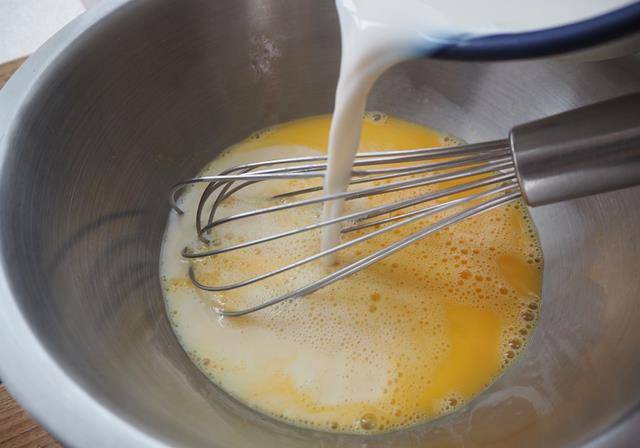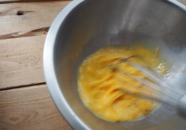 1.将鸡蛋和蛋黄放入大碗中,为了避免起泡,像用刀切一样将蛋打匀