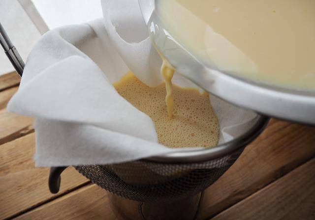 3.在锅边开始出现沸腾小泡泡之前关火,慢慢地倒进步骤一的蛋液中。