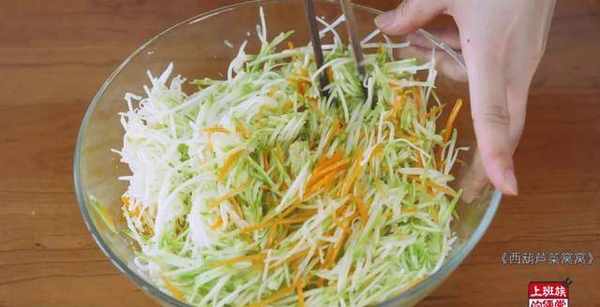 胡萝卜和西葫芦擦成细丝,加一勺盐,腌一会让它们脱脱水,用纱布把汁水挤干。