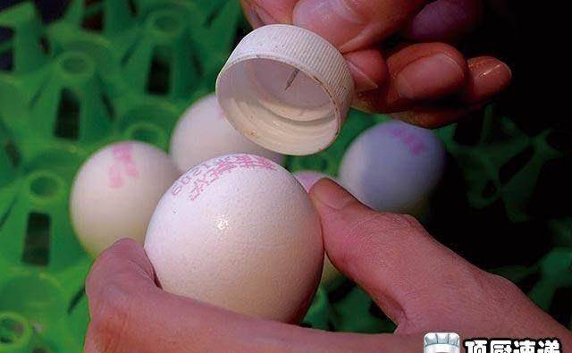 将宝特瓶盖对准鸡蛋气室,用图钉尖打一个小孔,放入滚水煮7分钟。