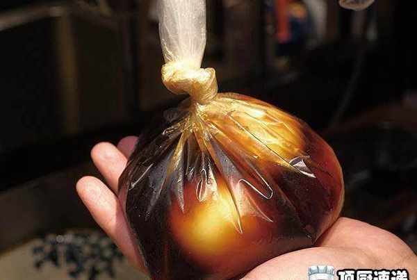 鸡蛋取出冰镇,剥壳后与卤汁放入塑胶袋,挤压出空气后封口冷藏1天。