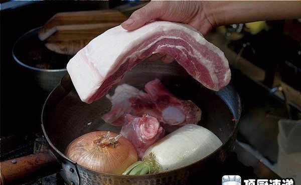 五花肉1条、猪大骨2根、洋葱1颗、萝卜半根、日式鲣鱼露200ml、白酱油100ml、猪油40ml、水2000ml