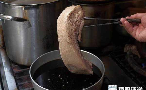捞出五花肉切厚片,再放回酱汁中浸泡2小时。