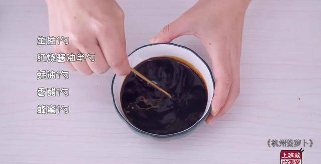 再来调个料汁,口味是酸甜酱香的:把1勺生抽、半勺红烧酱油、1勺蚝油、1勺香醋和1勺蜂蜜加一起搅拌均匀,蜂蜜和香醋可以增加风味。