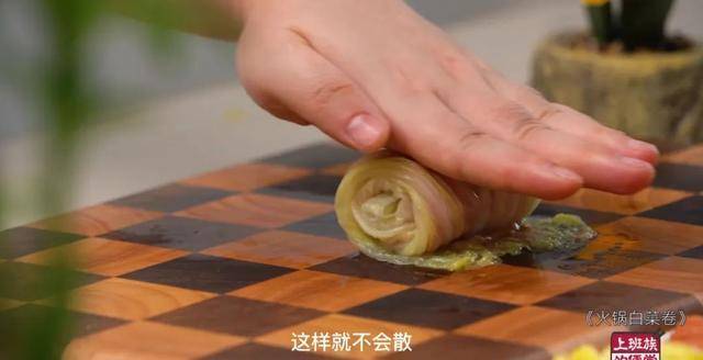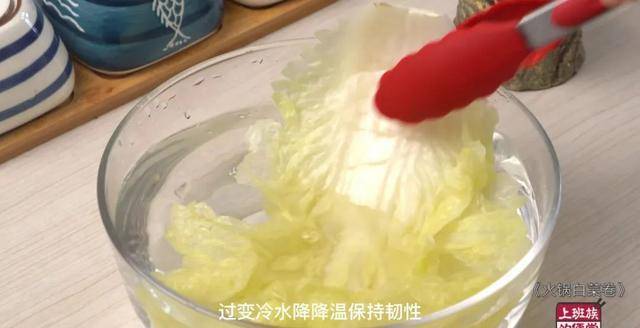 水微开的时候下白菜,烫个20秒,烫软的白菜更好卷,过遍冷水降降温保持韧性~