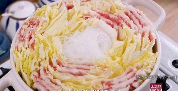 锅底铺上一层金针菇,码上白菜,中间留着位置放粉丝。
