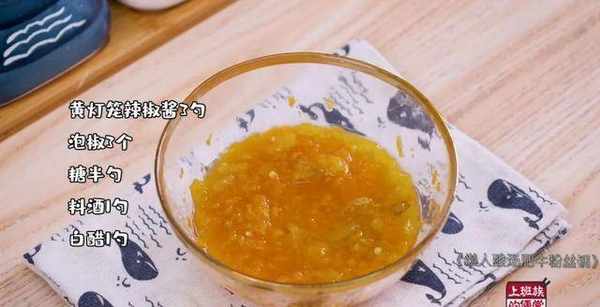 先来调个百搭的酸汤酱:黄灯笼辣椒酱3勺、料酒1勺、泡椒3个、糖半勺、白醋1勺,搅拌均匀。