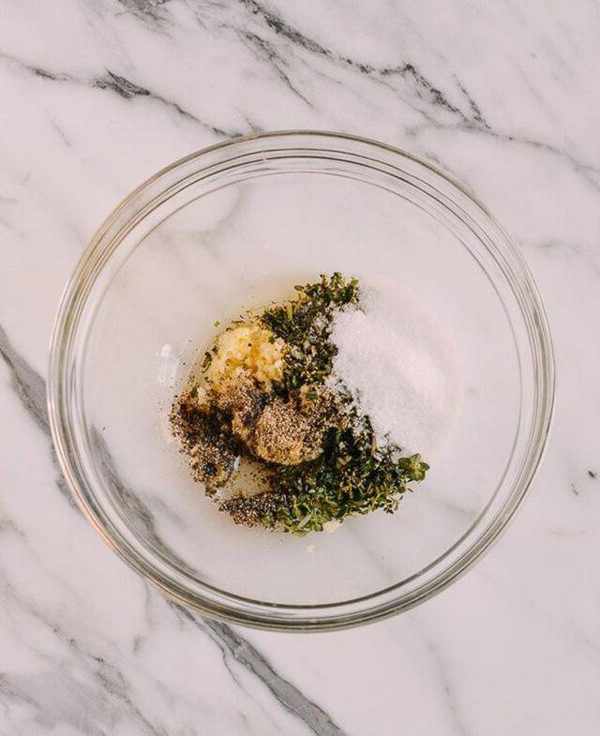 在腌制之前,用冷水快速冲洗牛肋排,然后擦干。把洋葱平铺在烤盘上。将盐,胡椒,大蒜,香草和橄榄油混合在一个碗里,直到混合均匀。