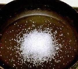 另外准备一口无油无水清洗干净的平底锅,直接倒入砂糖,用中火熬糖浆。