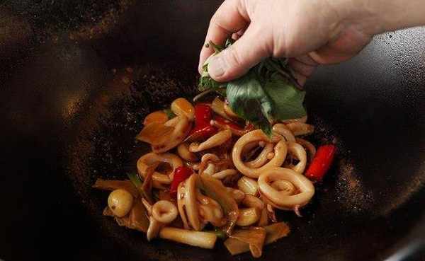 以小火炒至锅中水份收干,再倒入九层塔拌匀即完成。