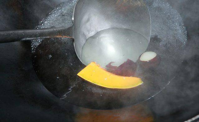 起锅开大火,倒500c.c.水量,待水煮沸时,先将龙须菜倒入烫50秒后捞起,再倒入玉米笋、茭白笋烫约3分钟捞起。最后将马蹄、南瓜倒入煮熟、约20分钟。