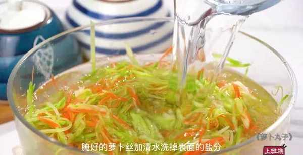 腌好的萝卜丝加清水洗掉表面的盐分,不然会齁咸,挤干水分就行。