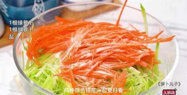 还加了点胡萝卜,两种颜色搭配在一起更好看,撒点盐腌出水分,待会好塑造性。