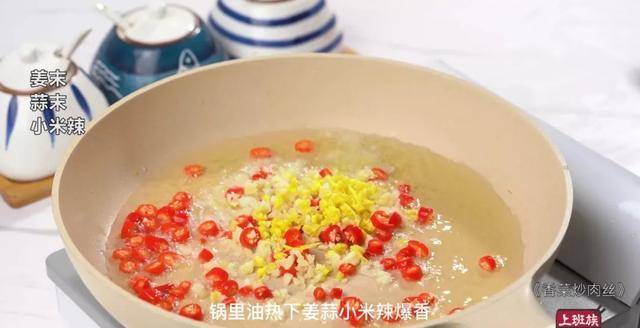 锅里油热下姜蒜小米辣爆香。