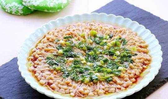 5、炒锅倒花生油,油热后浇到葱花和金针菇上,可以放凉后食用,更美味~