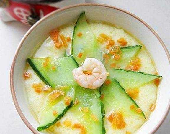 食材:鸡蛋60g、芝麻油适量、盐适量、黄瓜适量、虾仁适量、水适量、胡萝卜适量
