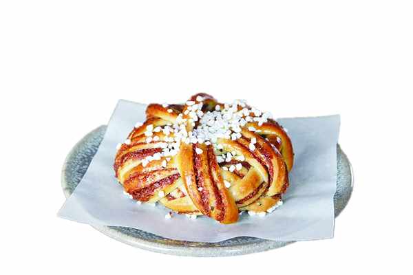 肉桂面包卷起源于瑞典,主要原料为发酵面团、肉桂以及糖和奶油,出炉后在表面撒上小颗粒的珍珠装饰糖,以增添口感和美化外观(如图)。肉桂本身具有一定的医疗功效,可以暖身、抗病菌和舒缓经期疼痛。在第一次世界大战后,瑞典当地的面包店和咖啡馆就开始出售肉桂面包卷,但是当时肉桂等源自东方的香料价格昂贵,并非所有人都能负担得起。直到20世纪50年代,欧洲经济复苏,一般家庭才能普遍使用肉桂。