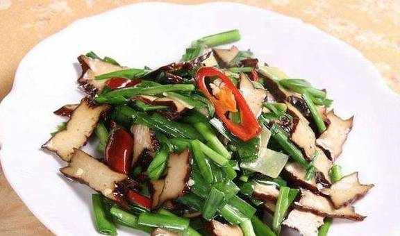韭菜炒香干食材:韭菜一小把,香干6块,红椒一个,油过量,盐少许,生抽数滴。做法:1.韭菜洗净,切段,香干洗净,切细条,红椒去籽切丝;2.炒锅加油烧热,下红椒丝和香干翻炒,参加少许盐、生抽调味,可加少许水;3.不停翻炒,待香干吸取汤汁变软变得疏松,参加韭菜,翻匀,待韭菜变软即可起锅。韭菜的主要营养成分有维生素C、维生素B1、维生素B2、尼克酸、胡萝卜素、碳水化合物及矿物质。韭菜还含有丰富的纤维素,每100克韭菜含1.5克纤维素,比大葱和芹菜都高,可以促进肠道蠕动、预防大肠癌的发生,同时又能减少对胆固醇的吸收,起到预防和治疗动脉硬化、冠心病等疾病的作用。