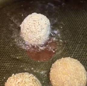 热锅加油,油温五层热转小火,放入锅中,小火慢炸,炸至表面金黄,虾球熟透即可。