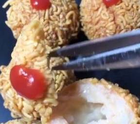 就这样,虾球就做好了,这样做的虾球,外面有方便面碎的酥脆口感,内里是虾肉,口感非常好,有嚼劲,而且还有猪皮冻,简直不能再美味了,如果大家有时间的话,强烈建议大家做一下,如果喜欢,就分享出去哦~